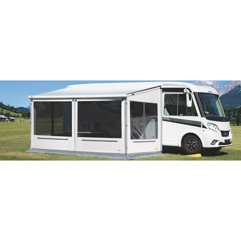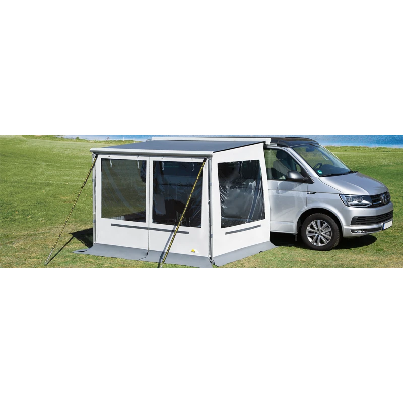 Façade Rain Outside de DWT s’adaptant sur la barre de charge frontale des stores pour camping-car, fourgon et van aménagé. Permet de vous abriter du vent et de la pluie lors de vous séjours extérieurs. Universel, il convient pour les stores FIAMMA et THULE.